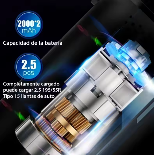 Su batería dual de 2000 mAh ofrece energía suficiente para inflar hasta 2.5 llantas de auto con una sola carga. Rendimiento constante, donde y cuando lo necesites.